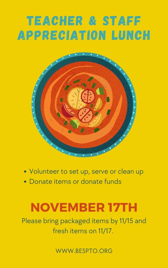 Contribute to our Teacher & Staff Luncheon on Nov. 17th! Volunteer to serve, set up or clean up. Or you can bring store-bought items to the office by Nov. 15th or fresh items on Nov. 17th. Sign up here: https://www.signupgenius.com/go/70A0C48ADA62FA3F58-45963810-feast#/