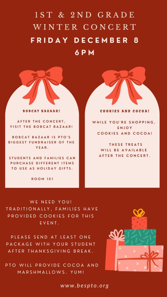 Make a note on your calendars for the upcoming Bobcat Bazaar and the 1st & 2nd Grade Winter Concert. The Winter Concert is scheduled for Friday, December 8th at 6:00 pm. As a tradition, families have contributed cookies for this event. Starting next week, please send at least one package of cookies with your student. The PTO will supply and serve hot chocolate and marshmallows after the concert. After the concert, your family can also enjoy shopping gifts that are $5 or less at our annual Bobcat Bazaar.